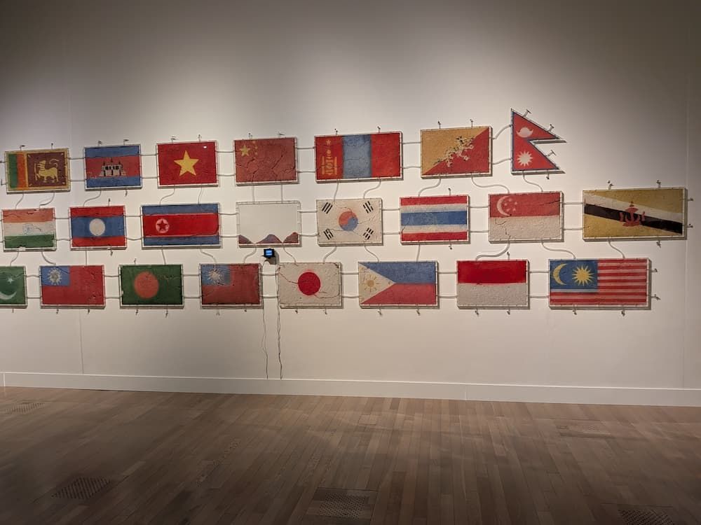 「時代のプリズム」は、比較対象に椹木野衣企画の「平成美術」を据えるとわりとの視点が際立つ。対象とする期間もかなりかぶるし、コレクティヴィズムの動向を追うという意味でも類似するのだけど、椹木が一国内の自閉的な歴史を描こうとしてしまうのに対して、「時代のプリズム」は平成年間の日本の国際的な交流のなかで生じたものを扱っている。 柳幸典の The World Flag Ant Farm はこの展示のコンセプトを象徴する作品だと言えるろう。砂で作られた各国の国旗を、蟻が這いまわって壊していく。この作品は国家間での交流による相互浸透の過程のようにも見える。「時代のプリズム」が扱うのは、まさにこうした事象で、オルタナティブスペースによる海外アーティストの招聘の紹介をプロローグに置くのは、それ以降の美術が国際交流のなかでの相互浸透的なプロセスであることを示そうとする意図があるとおもう。椹木にはまさにこうした視点がなく、確固たる日本のイメージを構築しようとしてしまう。柳が蟻の通路を作ることで、国旗のイメージが溶解させたような、そうした外と通じる通路が椹木には存在していない。